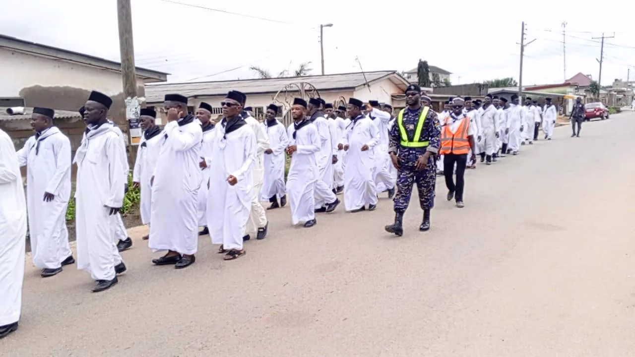 Members of the Greater Accra Majlis Ansarullah in a Route March during the 2025 Annual Regional Ijtema’a at Kasoa